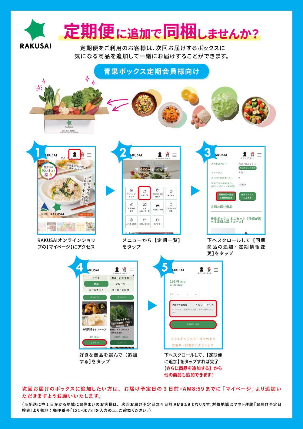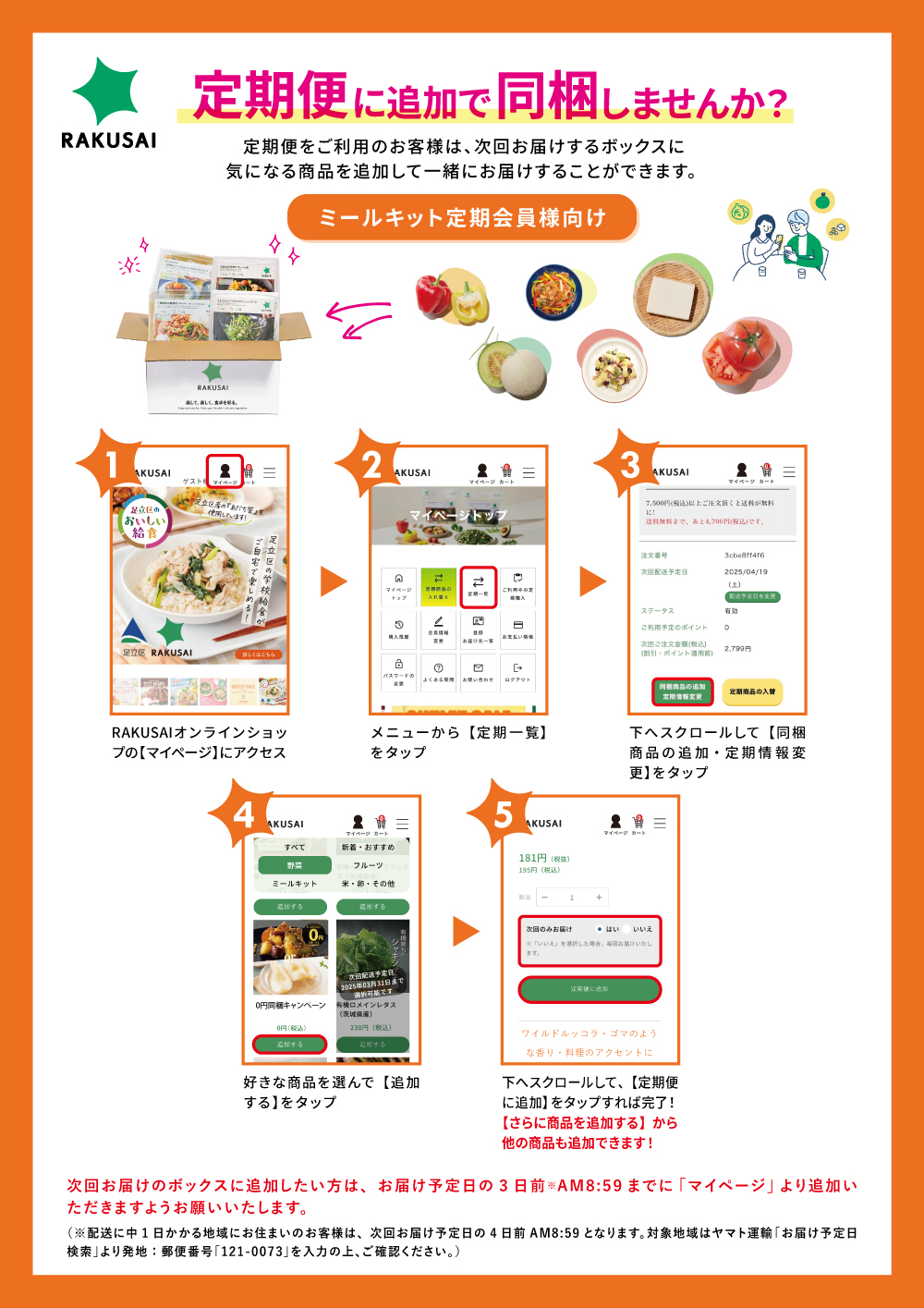 いつもRAKUSAIの定期便をご利用いただき、誠にありがとうございます。RAKUSAIオンラインショップでは、今年一年の感謝を込めて、12月限定で「0円同梱キャンペーン」第2弾を実施します!